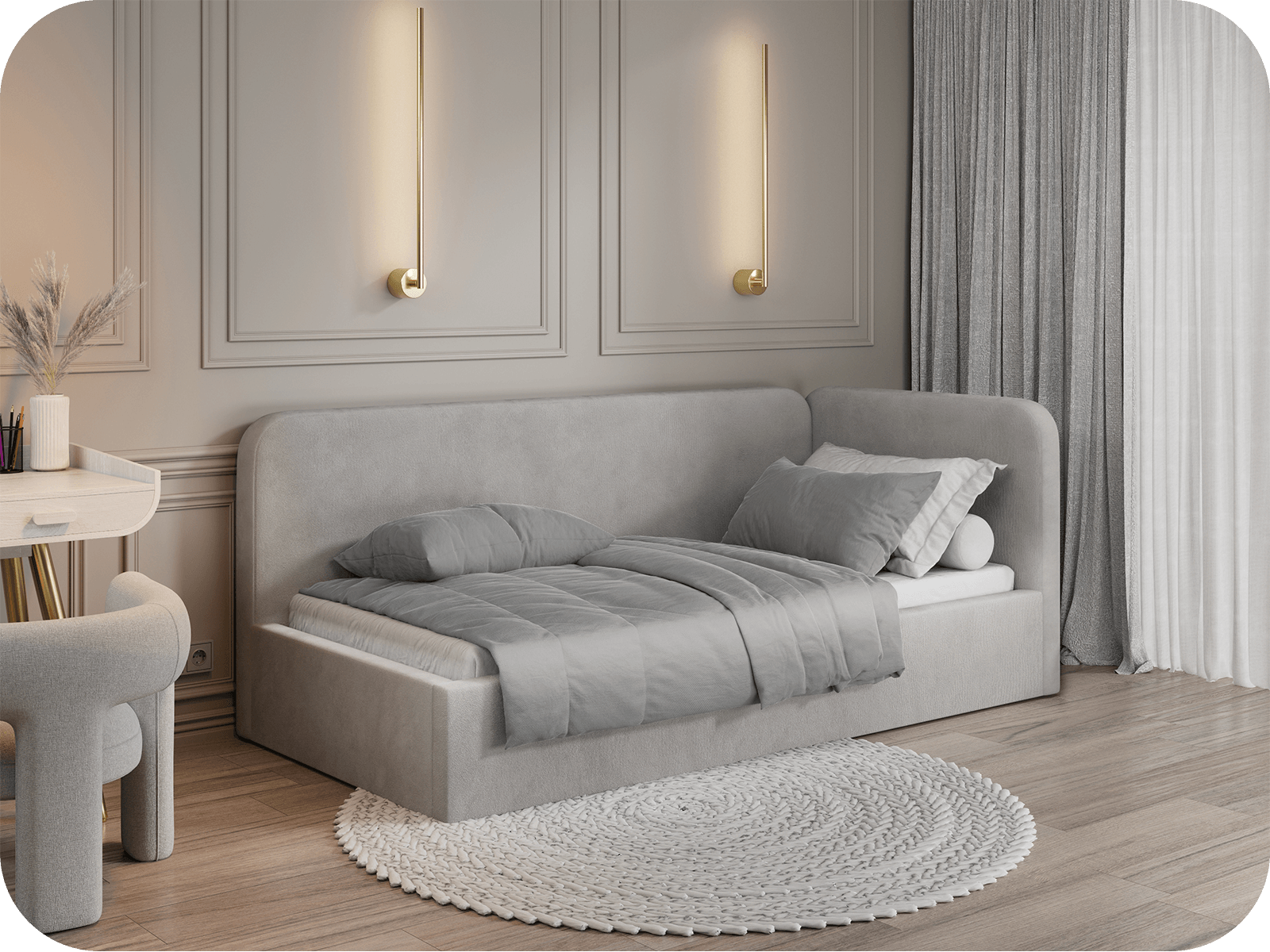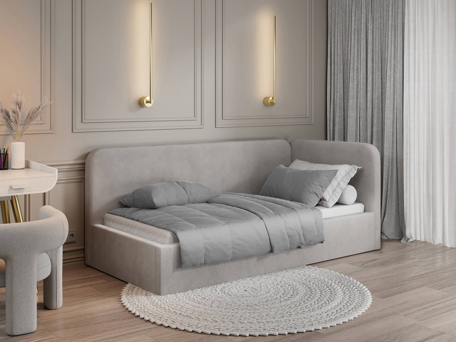 Dzięki kompaktowym wymiarom tapczan Leo doskonale sprawdzi się w mniejszych pomieszczeniach, oferując jednocześnie wygodne miejsce do spania oraz praktyczny schowek. Możliwość wyboru strony montażu bocznego blatu pozwala na idealne dopasowanie mebla do aranżacji wnętrza. Elegancka tkanina Bluvel firmy Fabb podkreśla nowoczesny charakter tapczanu i nadaje przestrzeni przytulności.