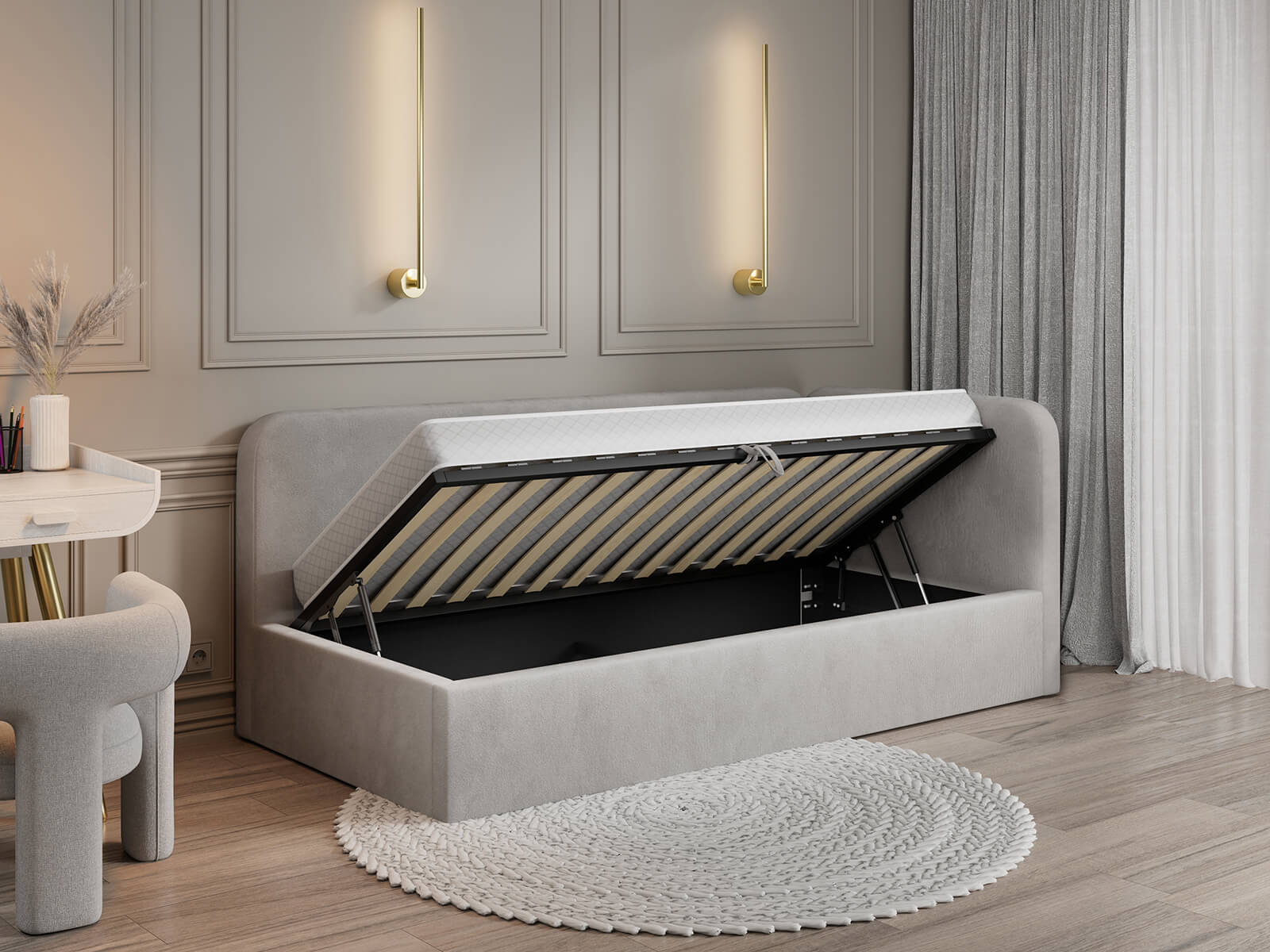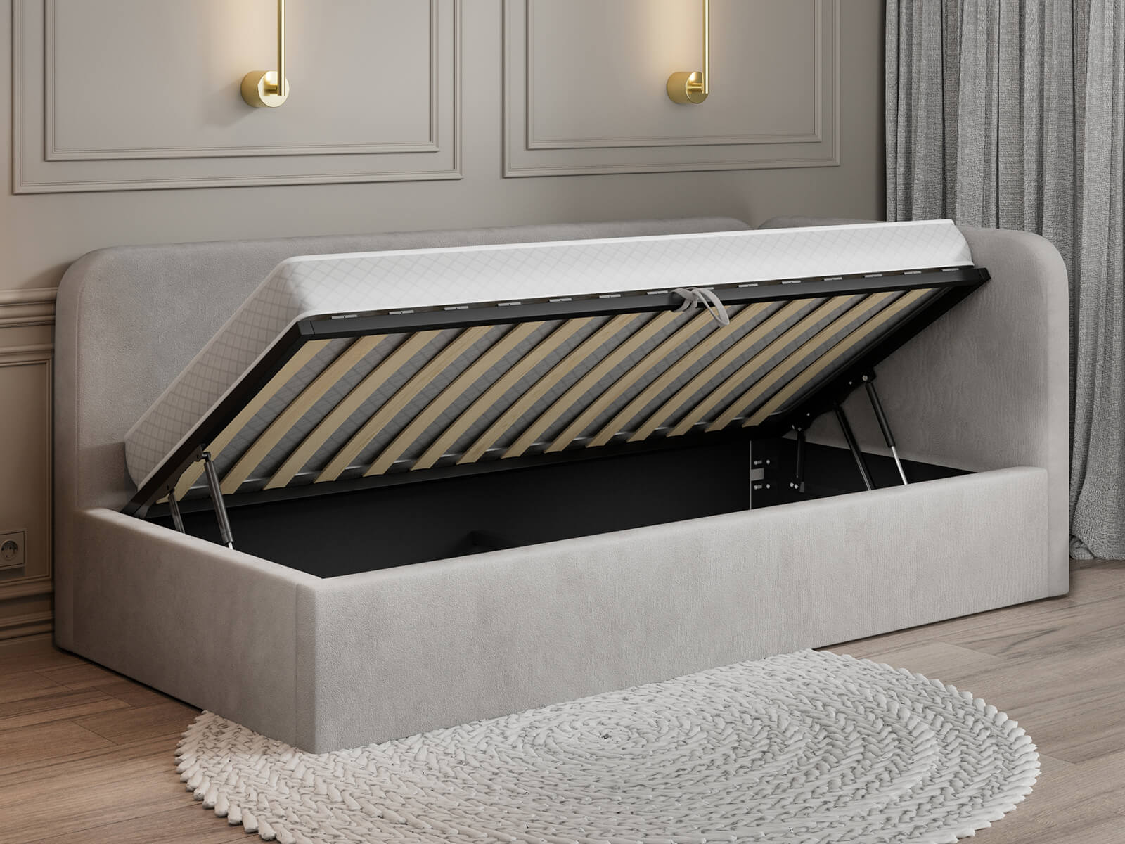 Funkcjonalność - Podnoszony stelaż z siłownikami gazowymi ułatwia codzienne użytkowanie i zapewnia wygodny dostęp do pojemnika na pościel.
