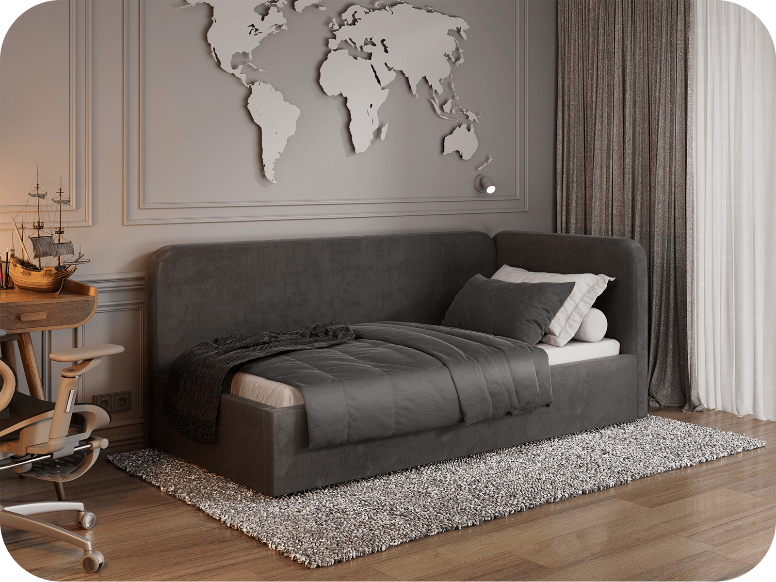 Dzięki kompaktowym wymiarom tapczan Leo doskonale sprawdzi się w mniejszych pomieszczeniach, oferując jednocześnie wygodne miejsce do spania oraz praktyczny schowek. Możliwość wyboru strony montażu bocznego blatu pozwala na idealne dopasowanie mebla do aranżacji wnętrza. Elegancka tkanina Bluvel firmy Fabb podkreśla nowoczesny charakter tapczanu i nadaje przestrzeni przytulności.