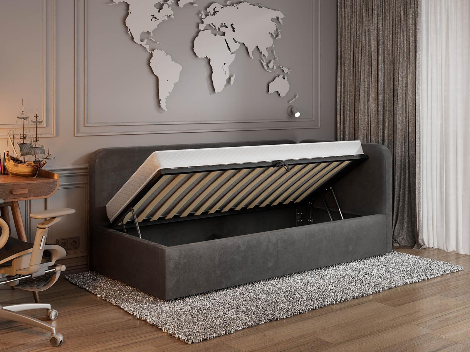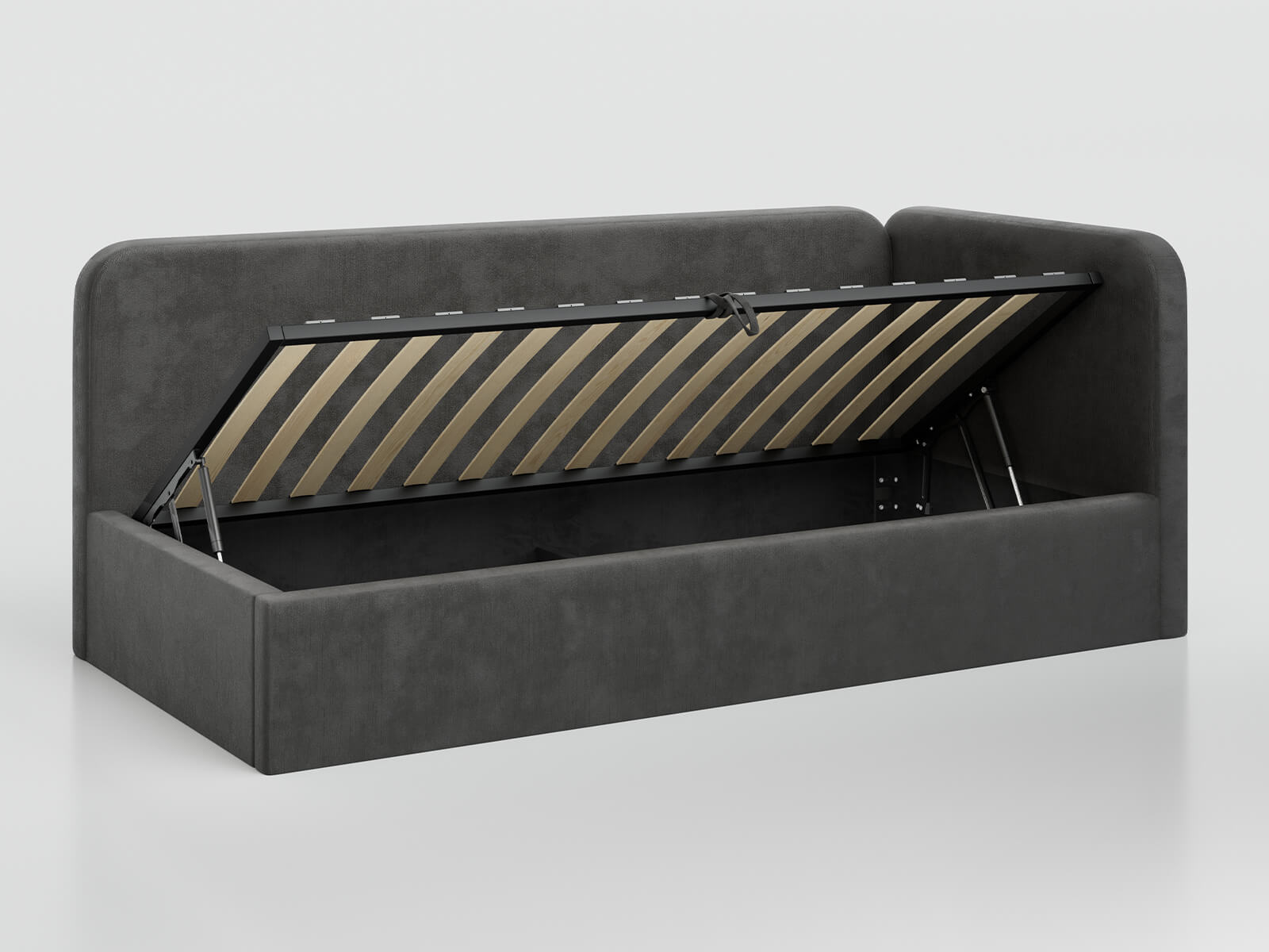 Pojemny schowek – podnoszony stelaż z siłownikami gazowymi ułatwia dostęp do przestrzeni na pościel.