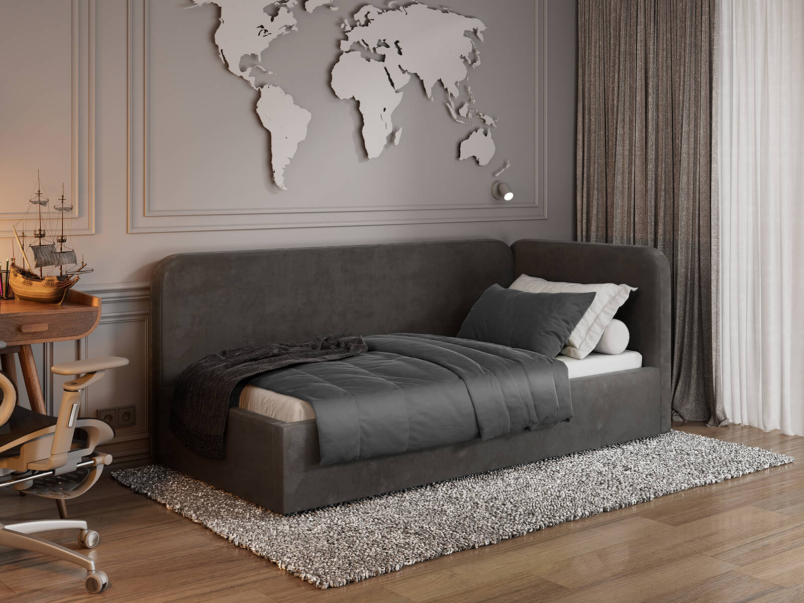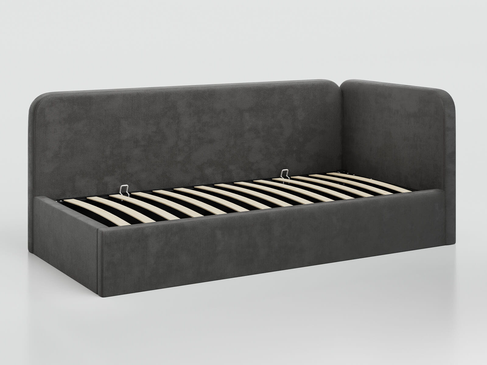Tapczan jednoosobowy tapicerowany 90x200 z pojemnikiem ze stelażem Bluvel 18 Grafitowy Leo