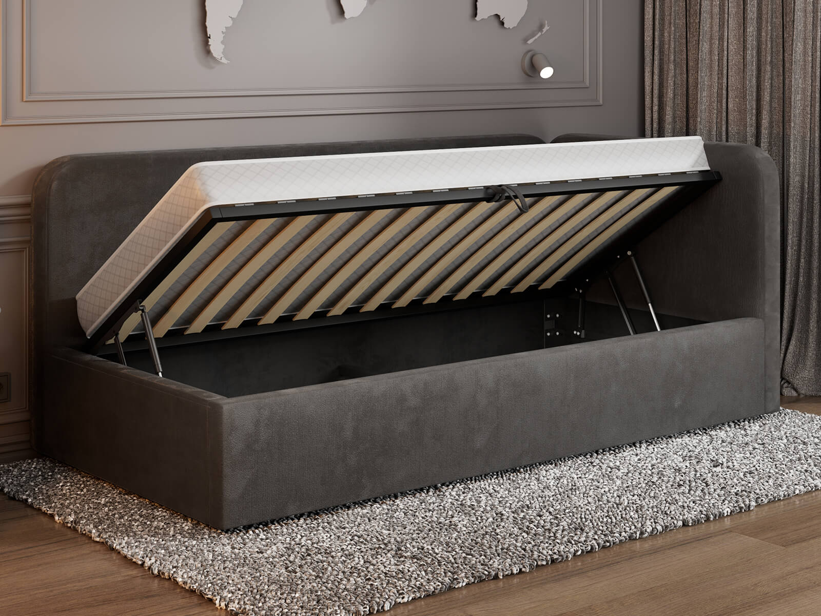 Funkcjonalność - Podnoszony stelaż z siłownikami gazowymi ułatwia codzienne użytkowanie i zapewnia wygodny dostęp do pojemnika na pościel.